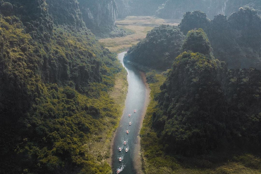 Tràng An chào đón bạn vào một buổi sớm lãng đãng, khi những tia nắng đầu tiên len lỏi qua vách núi. Nơi đây hiện ra với những ngọn núi đá vôi sừng sững và những dòng sông uốn lượn hiền hòa. Tiếng chim hót vọng từ hang động, tạo nên một không gian yên bình và thư thái. Hãy để tâm hồn bạn hòa mình vào khung cảnh rộng lớn của cố đô, cảm nhận nhịp sống chậm rãi nơi đây, một vùng đất như ngưng đọng thời gian, đưa ta vào giấc mơ vừa hùng vĩ vừa thanh tịnh.